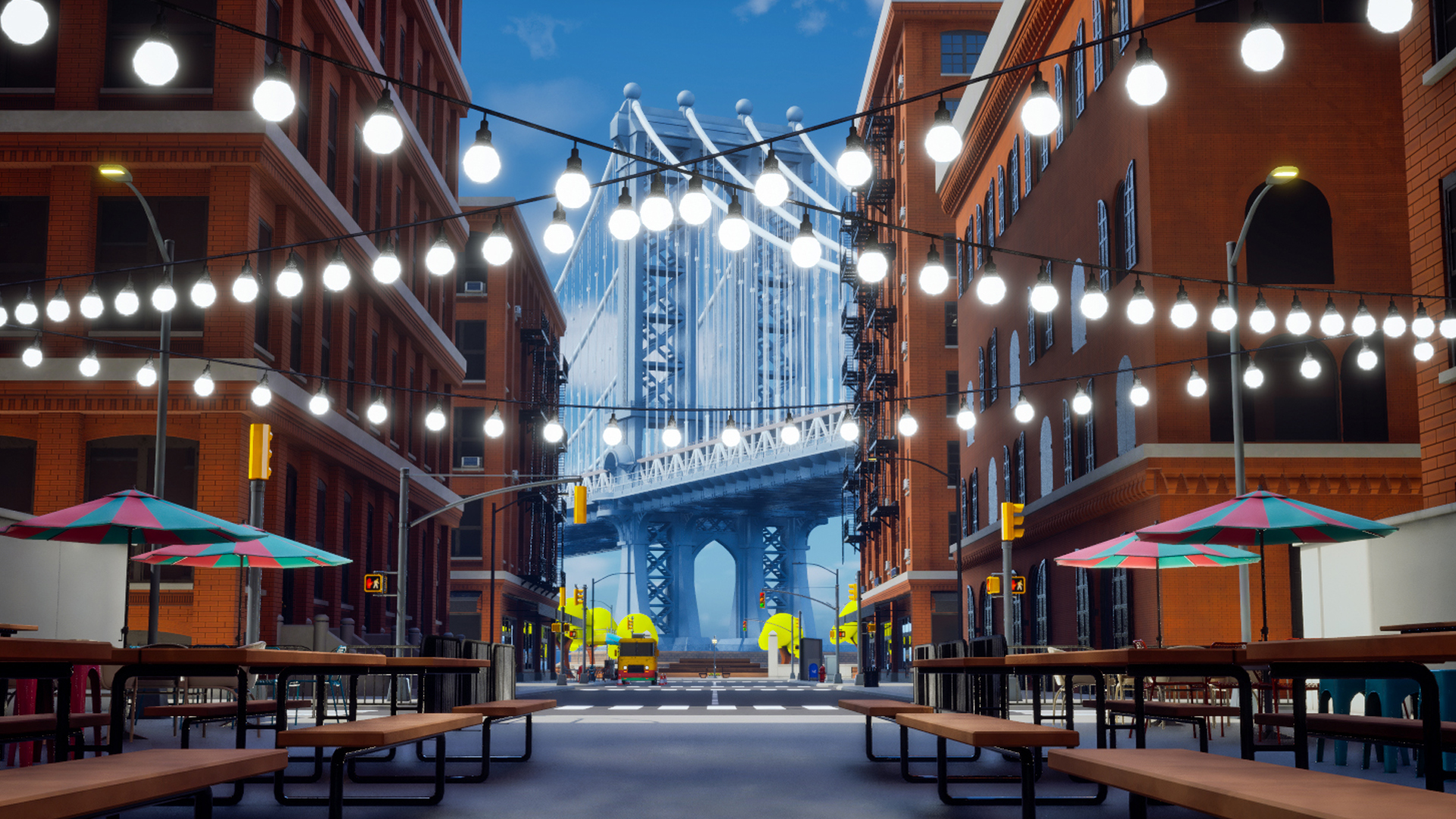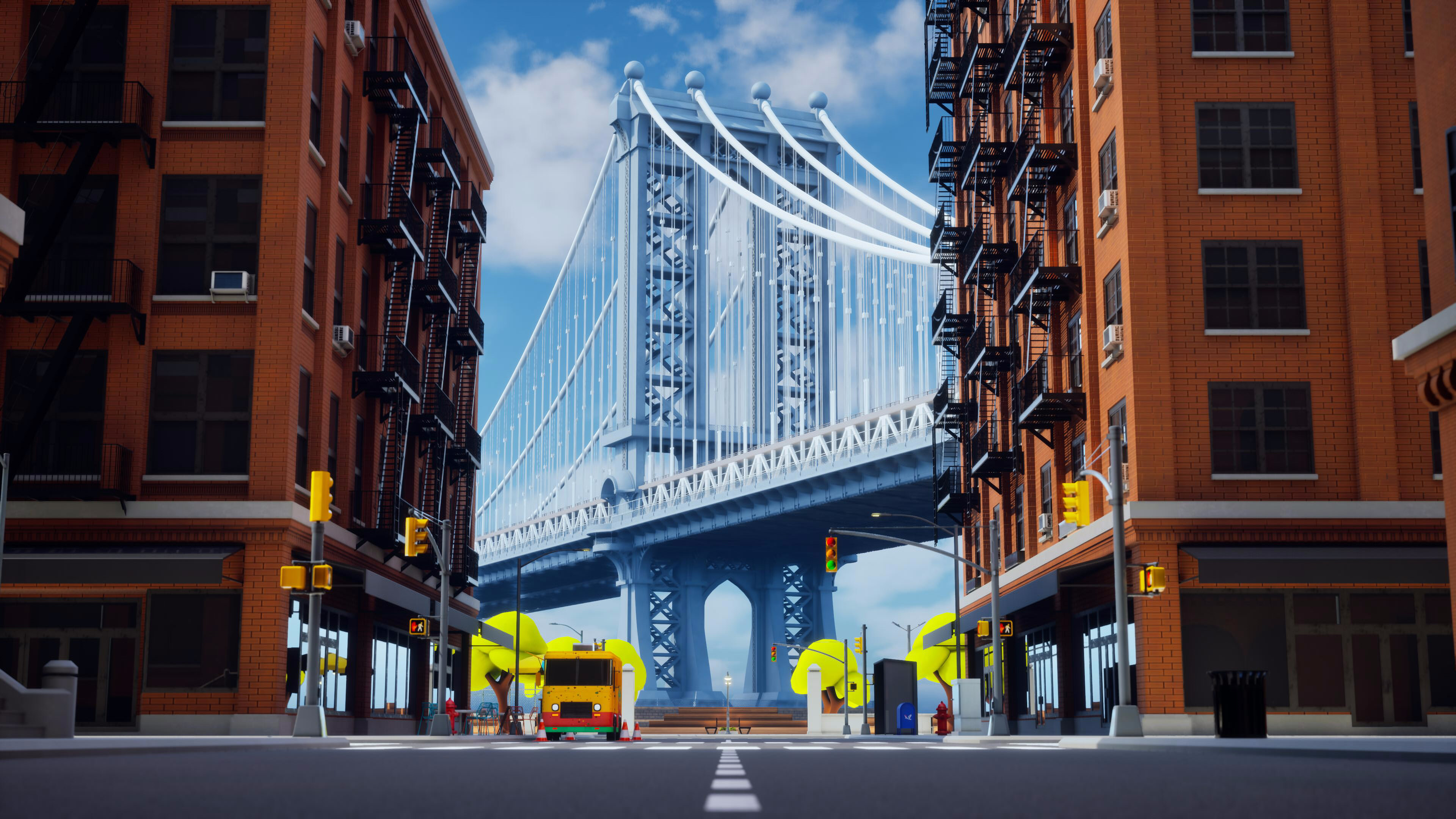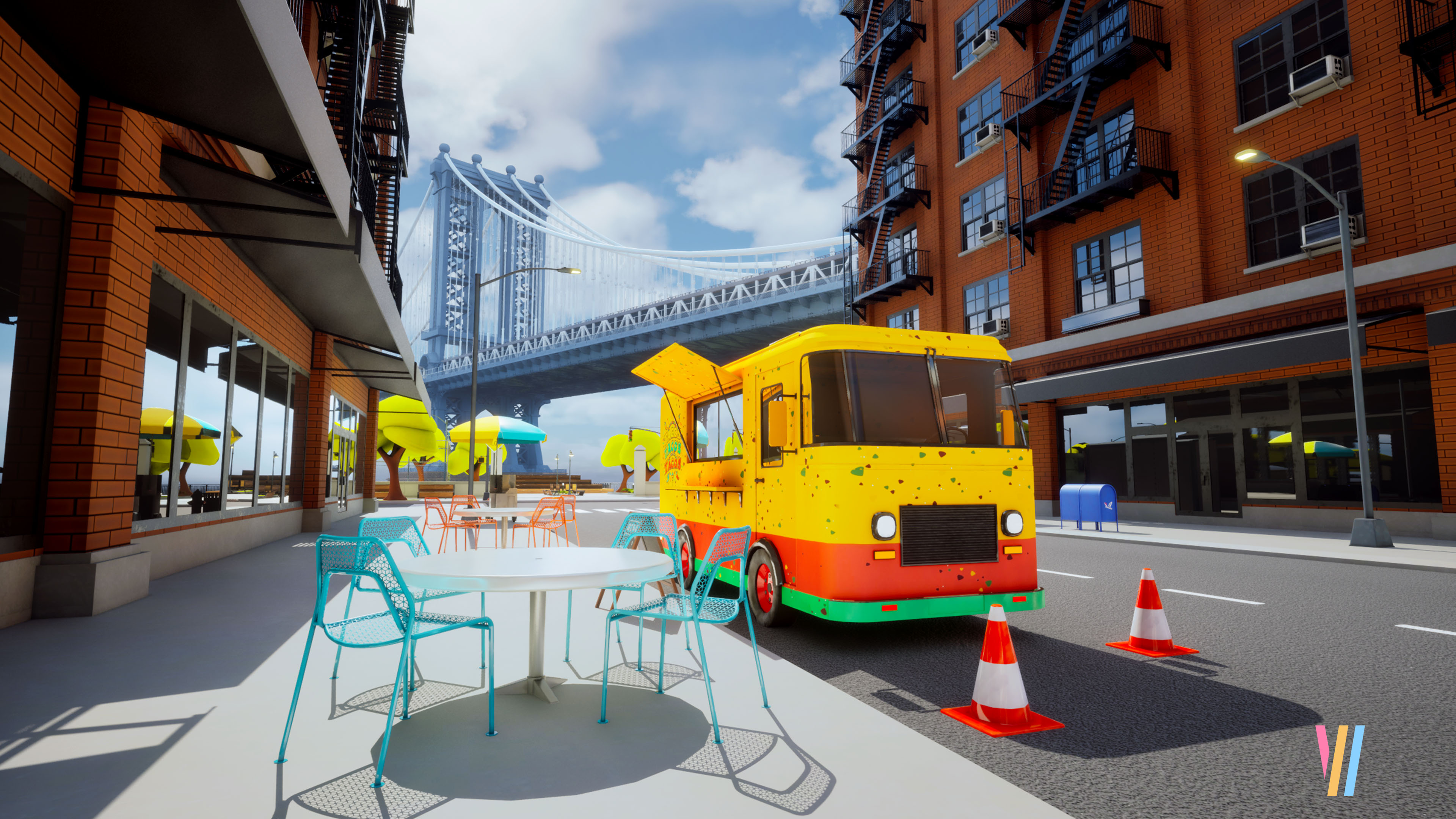 Dumbo Park was inspired by my earlier Stylized Pizza Truck concept, expanding it into a lively, stylized urban scene based on New York’s Dumbo neighborhood.