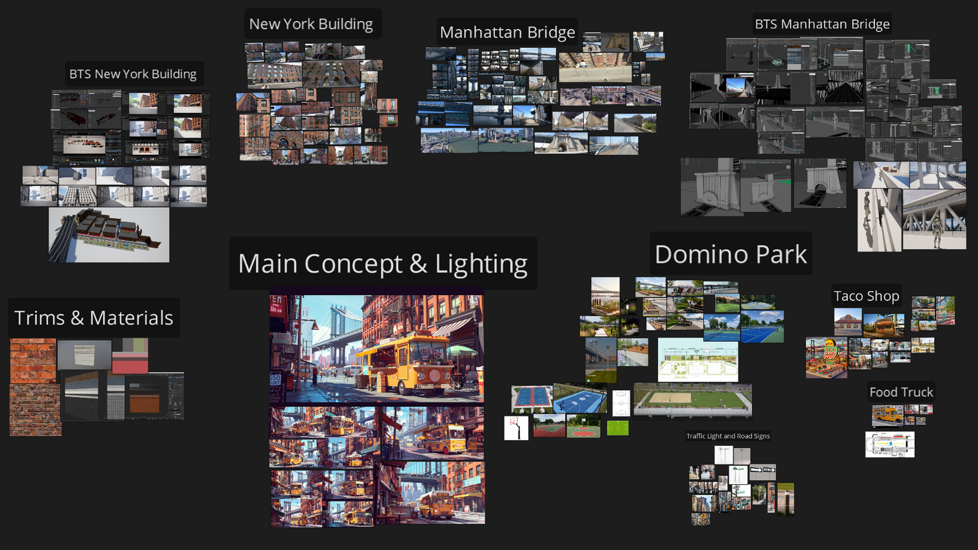 Using Maya for modeling, Substance Painter for texturing, and Unreal Engine 5 for rendering, I developed detailed and optimized assets, including modular building pieces, a taco shop, a taco truck, and the Manhattan Bridge. I also utilized blueprints to streamline the creation of this scene.